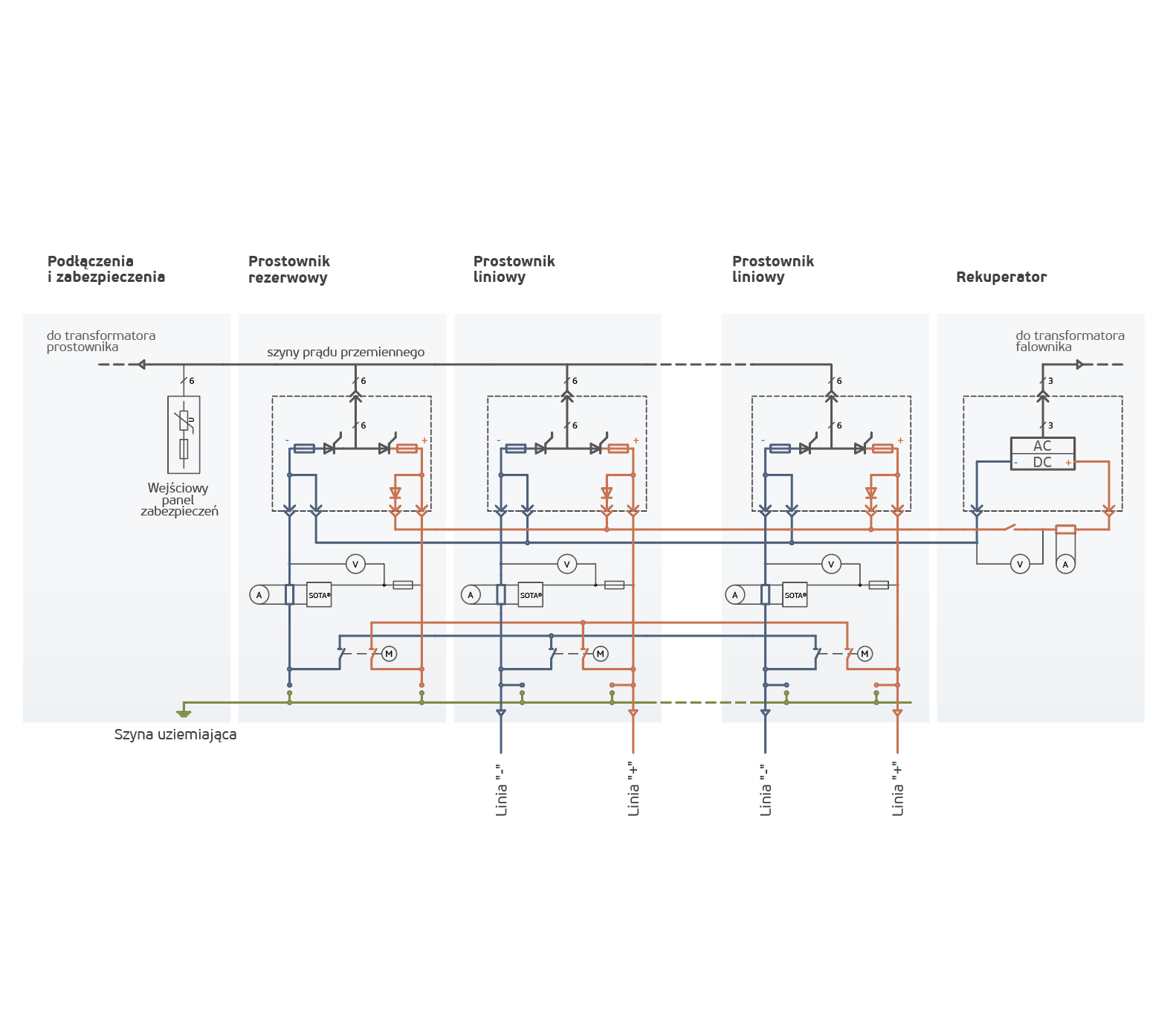Prostowniki liniowe – główne urządzenia zapewniające zasilanie i ochronę odcinka sieci trakcyjnej;