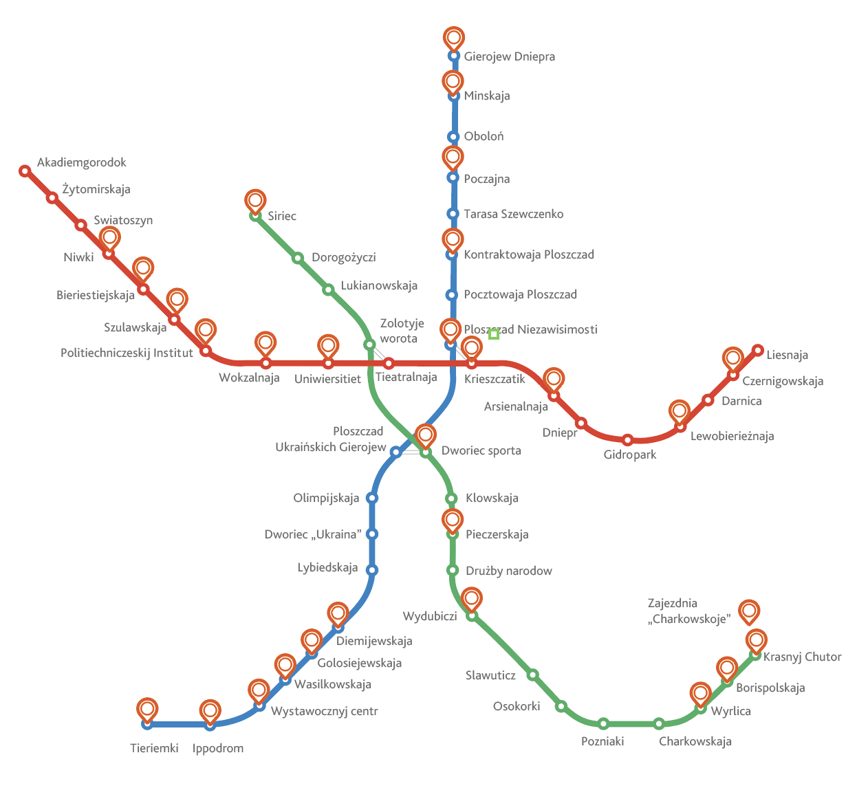 12 electrical substations of "Nyvky", "Beresteiska", "Shuliavska", "Politekhnichnyi Instytut", "Vokzalna", "Universytet", "Kontraktova Ploshcha", "Maidan Nezalezhnosti", "Khreshchatyk", "Arsenalna", "Chernihivska", "Livoberezhna" stations